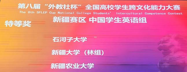 2025年10月25-26日,第八届“外教社杯”全国高校学生跨文化能力大赛新疆赛区复(决)赛在新疆大学落下帷幕。由我院教师团队辅导的2支代表队,经过与来自全疆各大高校的26支精英队伍的激烈角逐,勇夺英语组决赛特等奖和国际留学生组决赛二等奖的好成绩,这是我校首次在该项赛事中晋级决赛并斩获最高奖项,标志着我校在跨文化人才培养方面取得重要突破,也充分展现了我校学子的非凡风采与跨文化综合素养。