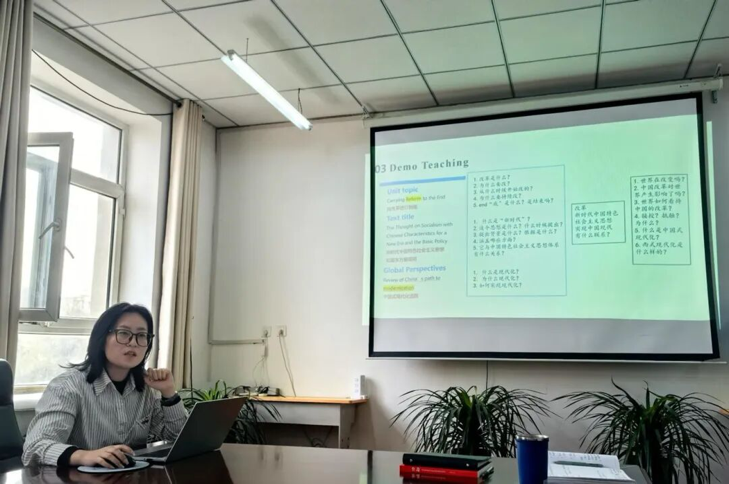 景老师根据《理解当代中国》系列教材讲师团培训心得,结合自身两轮相关课程授课经历,以《理解当代中国---英语读写教程》第六单元 “Carrying Reform to the End”为例进行示范说课,强调以历史观,系统观为思路,深入挖掘当代中国知识,充分发挥教师穿针引线的导学功能,帮助学生借助语言互动探索知识,同时依托知识探讨促进语言实践。