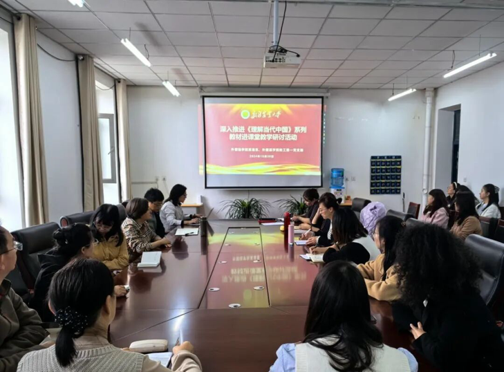 10月30日下午,英语专业教研室在学院会议室举行了深入推进《理解当代中国》系列教材进课堂教学研讨活动。本次教研活动邀请了我院“三进”读写课程团队负责人景建平老师做分享交流发言。活动由英语系系主任唐彬主持,学院全体专任教师参加了会议。
