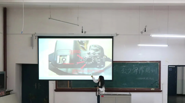 其次,外国语学院团委宣传部负责人李博雨手持照相机并利用幻灯片向大家演示如何使用照相机,其中包括相机三要素讲解,自我调试要素的数值以及如何实操。并且在现场,外国语学院团委宣传部负责人李博雨添加了新颖的提问环节,考察在场人员对于相机的使用情况,调动了现场气氛。