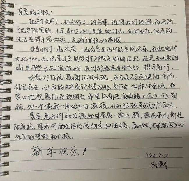 2023 癸卯年岁末,2024 甲辰年岁初,时序轮替,辞旧迎新。我们又迎来新的一年。多少个一元复始,多少次万象更新。我们坐下好好回望这一年,从中打捞起一些愉悦或沮丧的片段:在禾园餐厅吃到美味的螺蛳粉,在下雪时欣赏美丽的雪景,或是在赶往课堂的匆匆忙忙。为了丰富同学们的假期生活,增添趣味,让同学们体味书香,感受文字的魅力,由新疆农业大学外国语学院学生会学习部举办的此次“喜迎新春,书信同行”新年见信好手写信活动正向我们缓缓展开画卷。