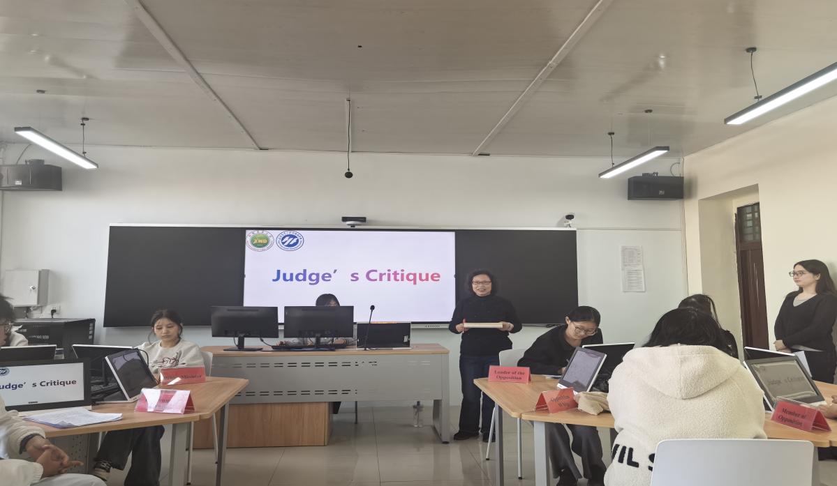 为深化课程思政建设,创新教学模式,提升学生的批判性思维能力、跨文化沟通素养与团队协作精神,外国语学院高级英语课程组于2025年11月12日在我院语言实训室成功举办了一场别开生面的英国议会制(British Parliamentary Style)英语辩论赛。本次活动作为《高级英语》课程重要的实践教学环节,将语言技能训练与思政育人目标有机融合,取得了显著成效。